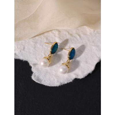 Blue imitation stone pearl pendant earrings for women retro temperament ear clips